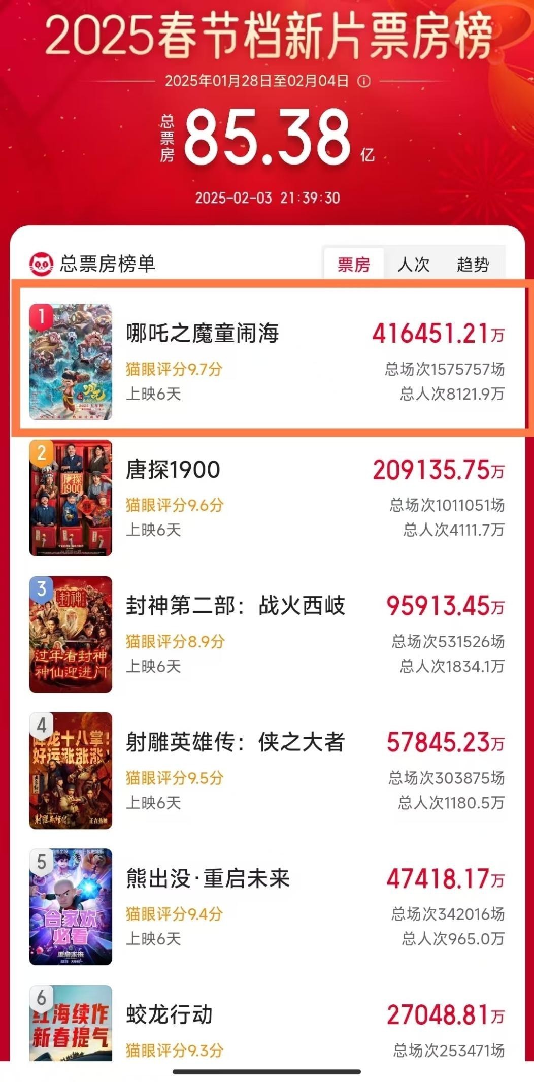 大年初六,春节档呈现出前所未有的盛况,总票房突破85亿,《哪吒之魔童闹海》票房一骑绝尘突破40亿,打破多项影史纪录。